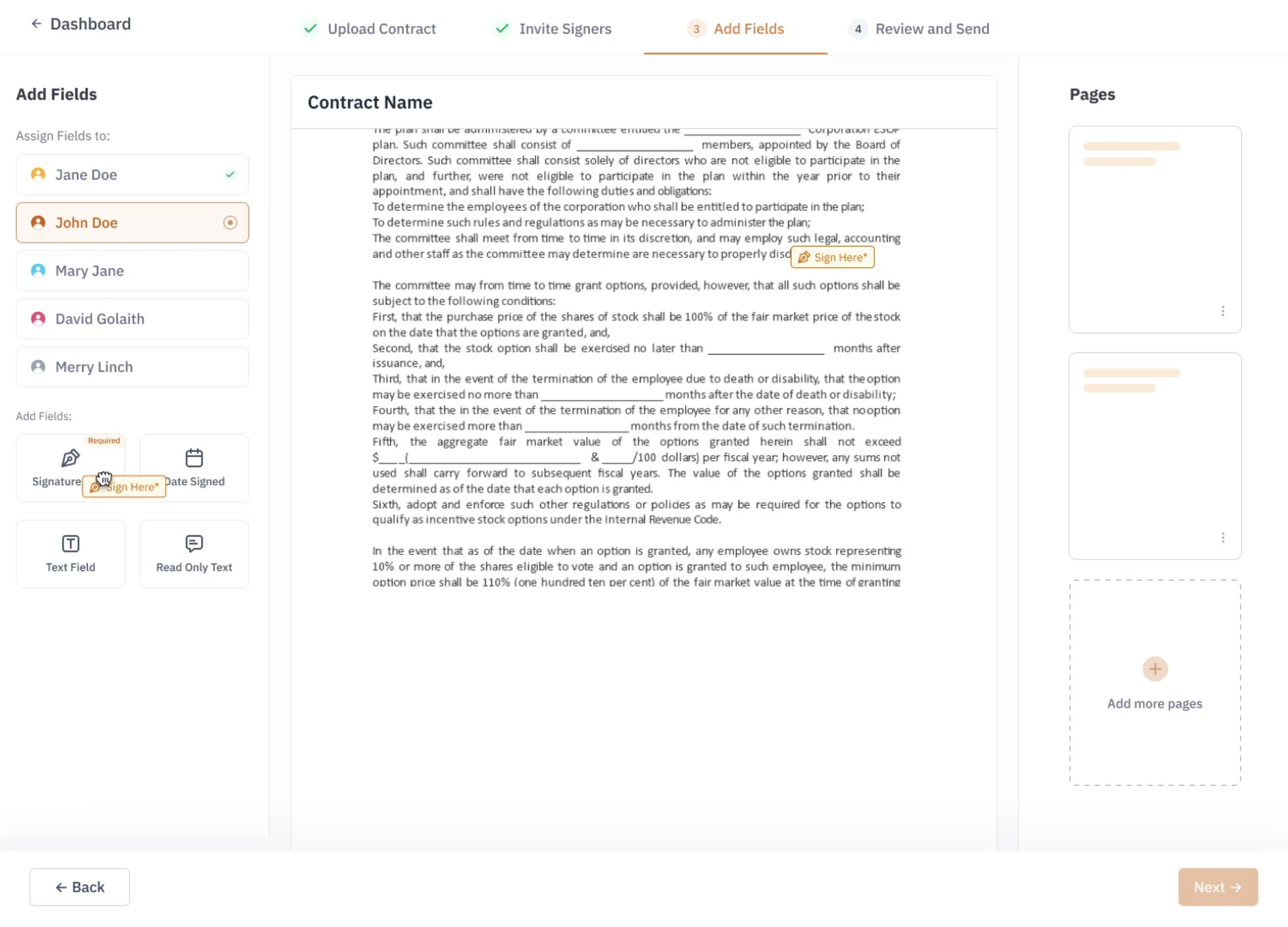 Prepare the document by adding fields for signers to fill in. A signature field must be added for each invited signer. Optional date signed fields, text input fields, and read-only text can also be added.